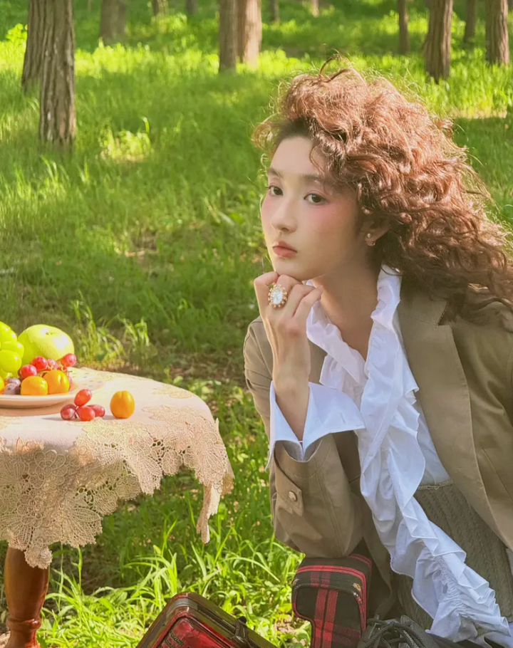 一头卷发,着西装白衬衫,复古优雅,妆容精致,尽显柔美梦幻