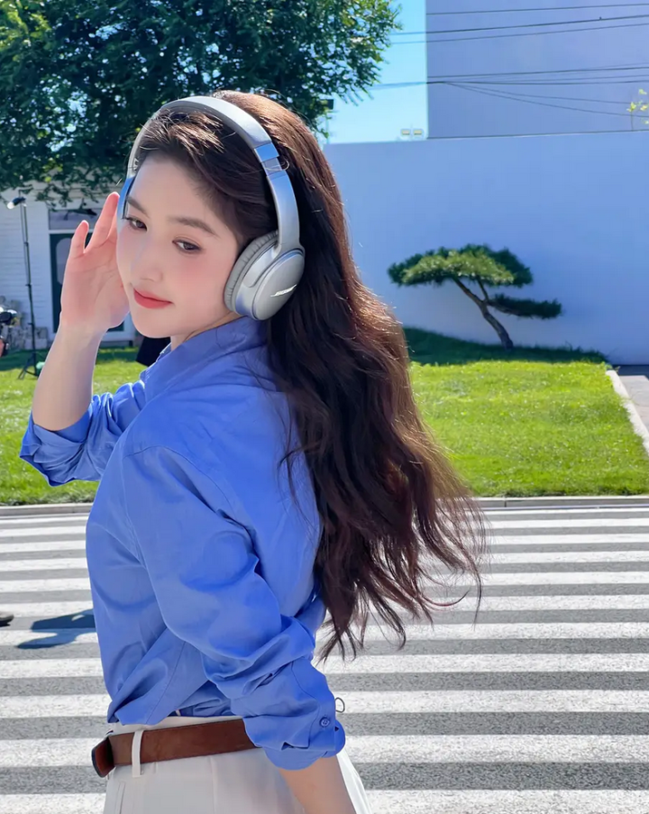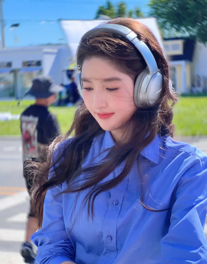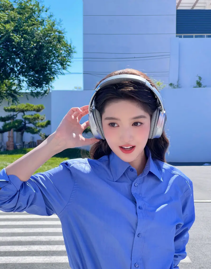 穿着蓝衬衫,头戴耳机,青春活泼