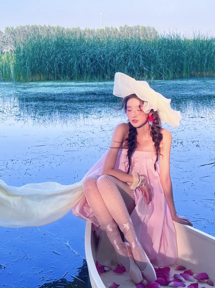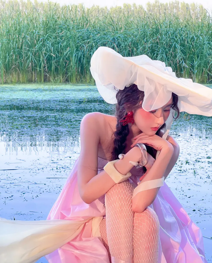 王玉雯的一组美照爆出,图中,王玉雯穿着粉色长裙头戴白色纱帽